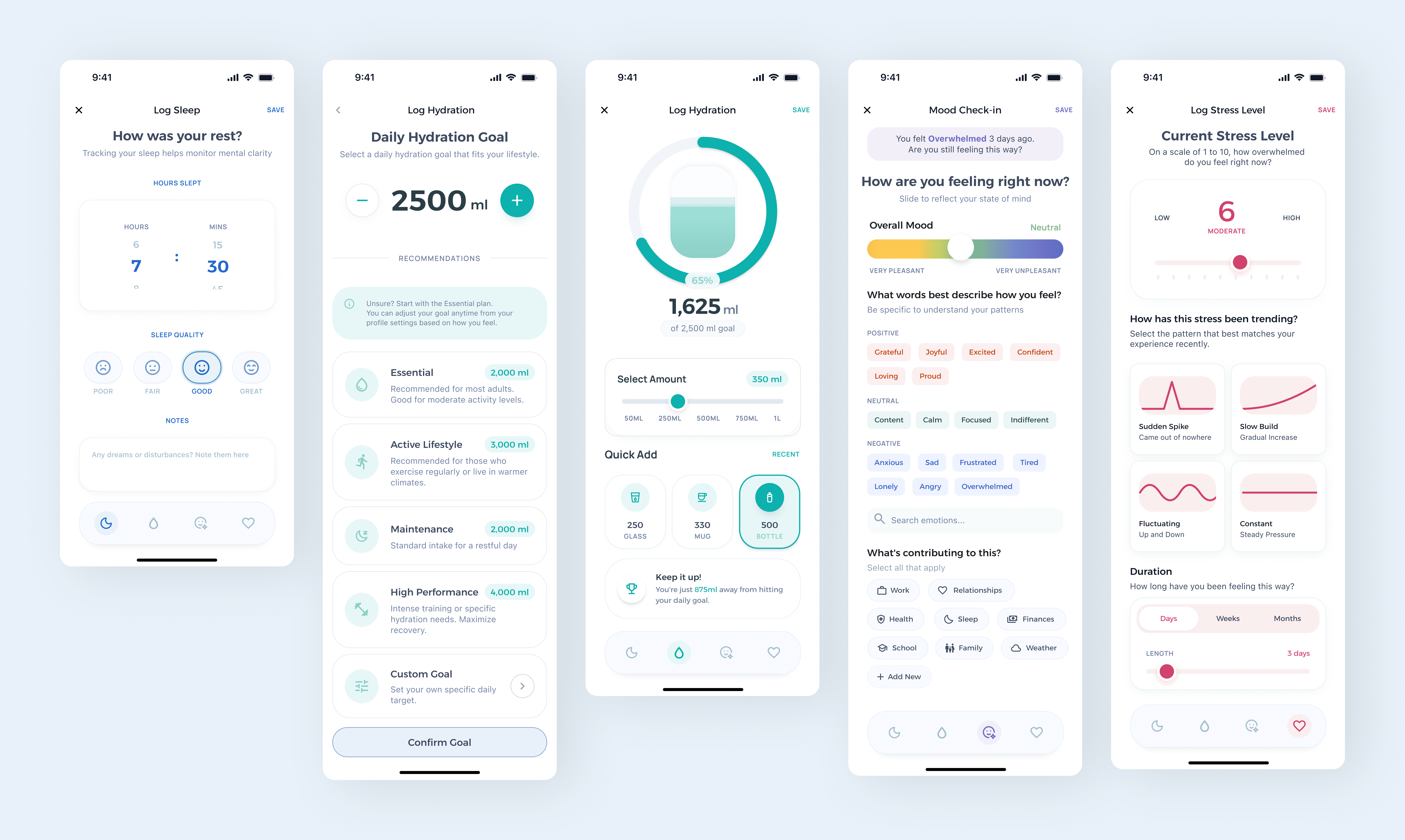 The goal was not to build another calorie counter or step tracker, but to reimagine health technology as a flexible companion that supports irregularity rather than punishing it. The core premise is to: translate fragmented health data (hydration, stress, mood, sleep) into humane, supportive guidance that adapts to real life.