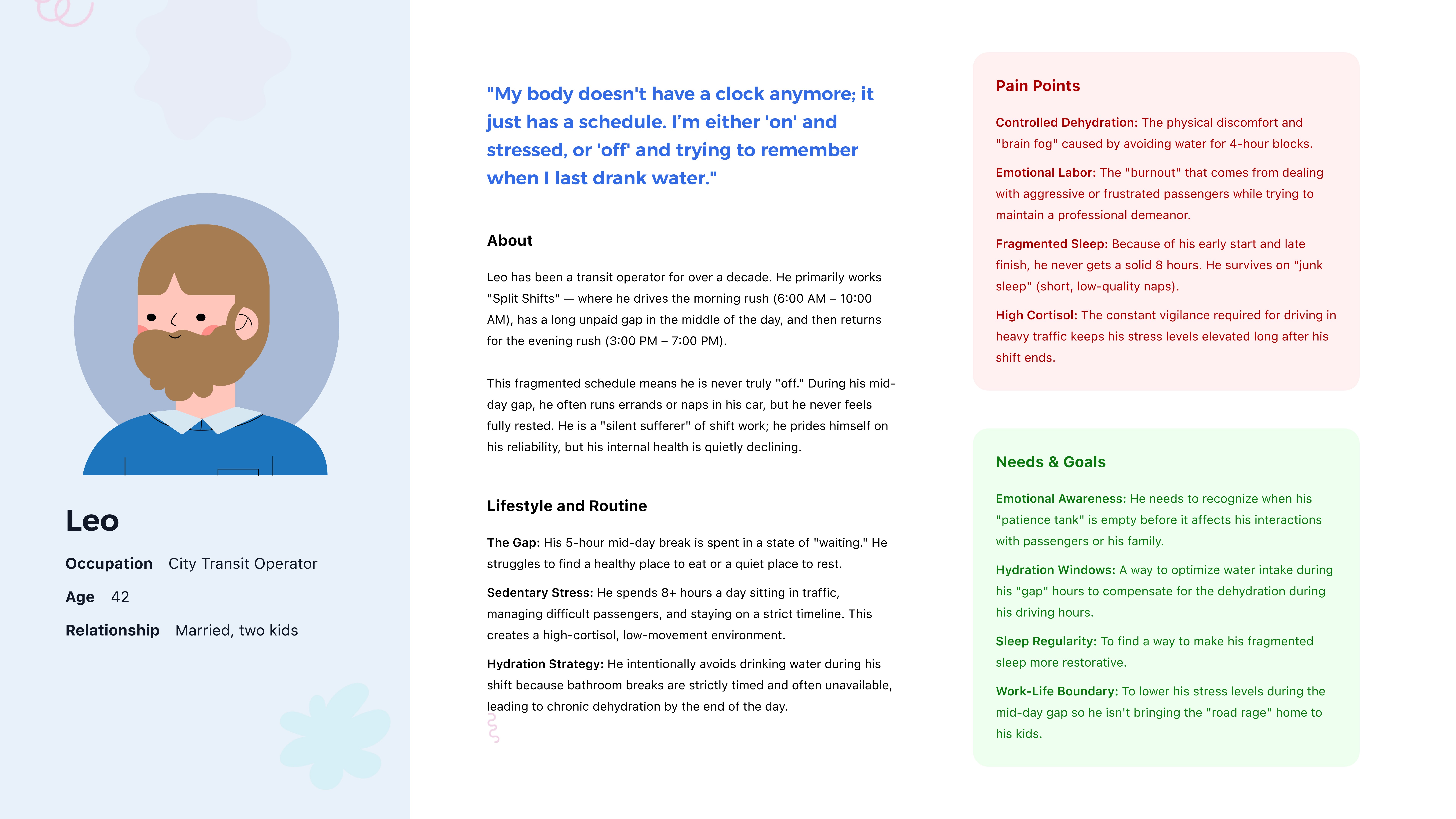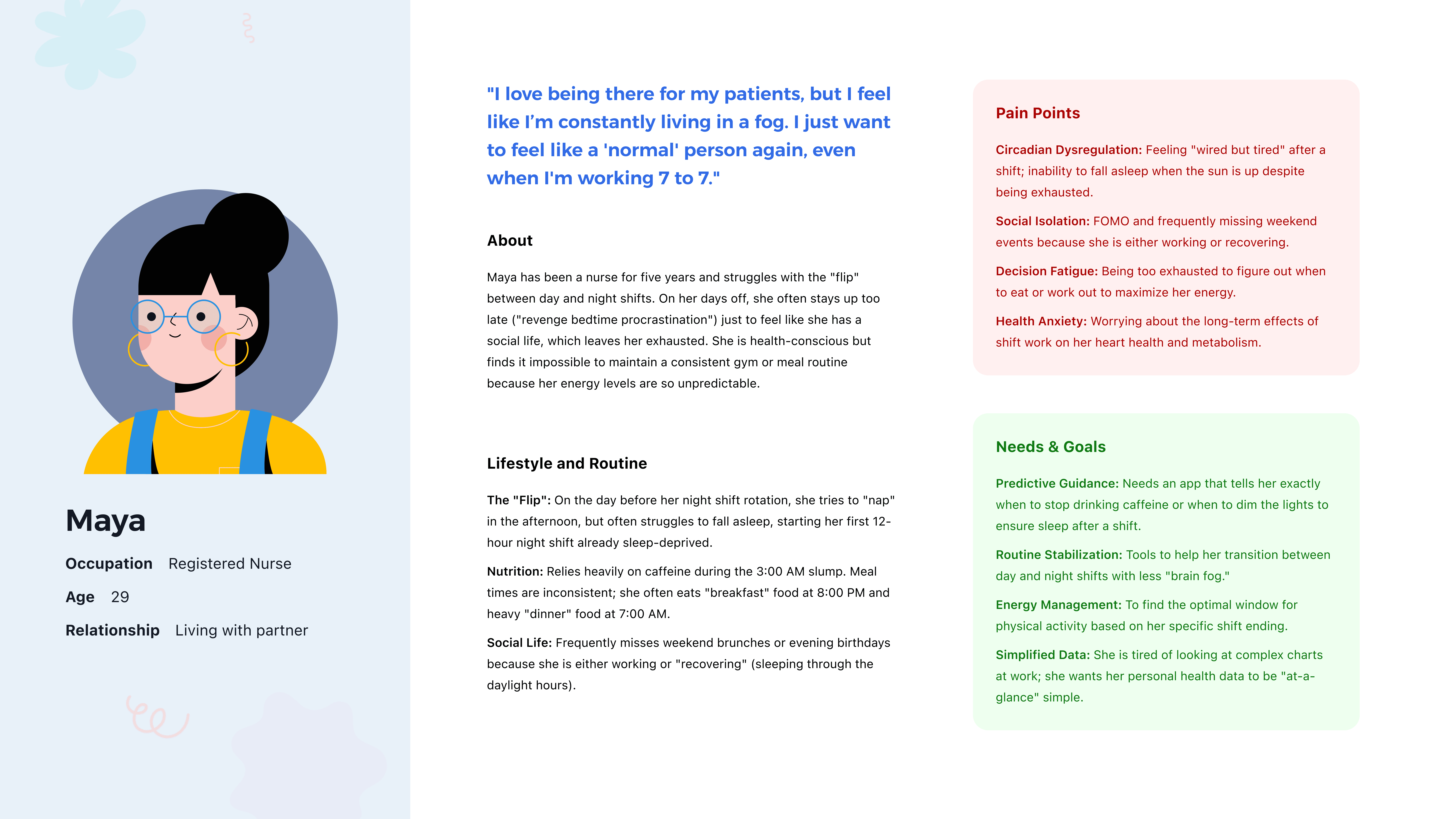 I mapped personas across different irregular lifestyles. For each of these users, the core use cases include sleep recovery guidance, fatigue alerts, flexible goal setting, and wellness tracking that aids messy, unpredictable schedules instead of penalizing them.
