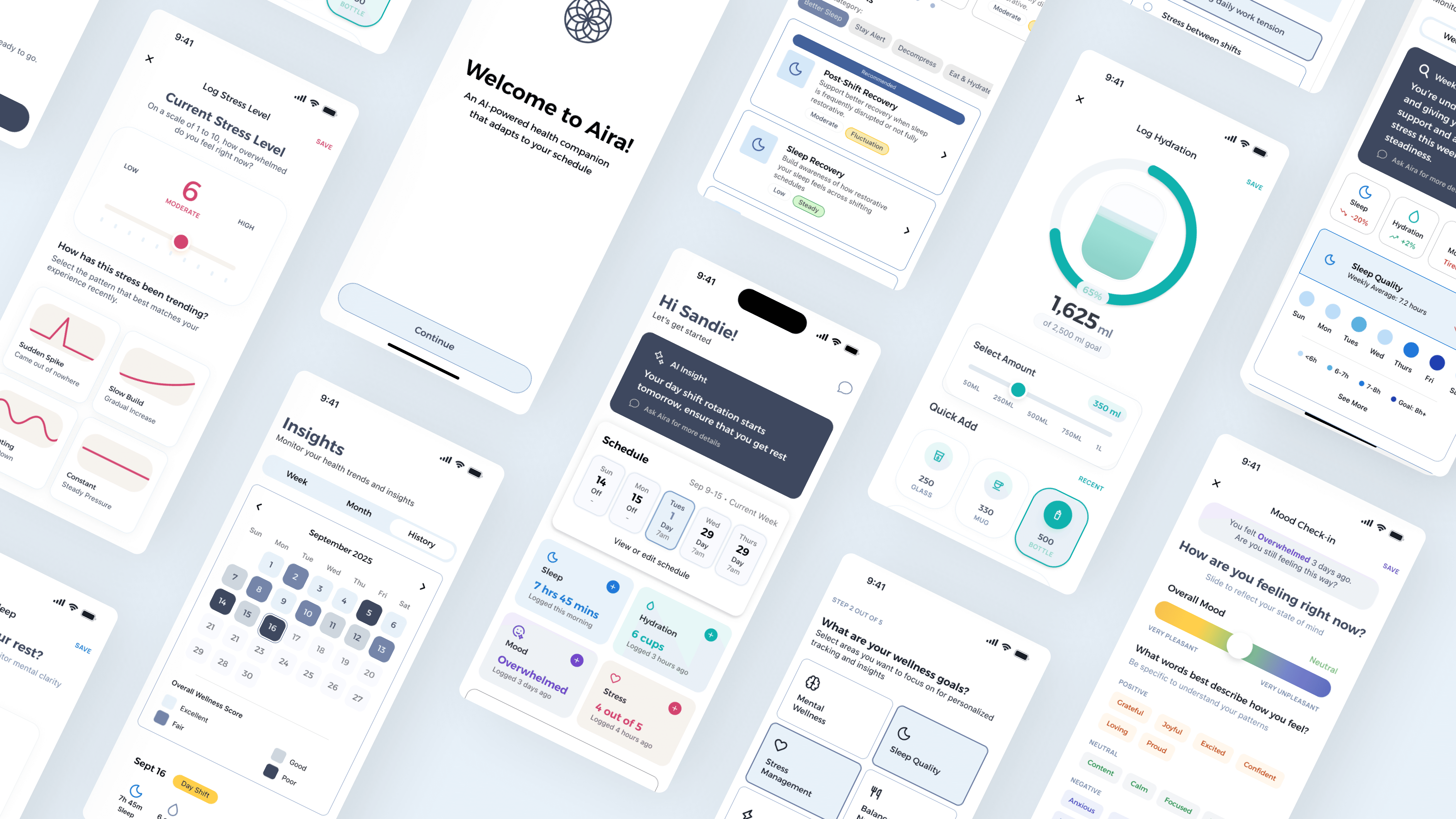 Aira is an AI-powered health and wellbeing app designed for people whose lives do not follow predictable 9-5 routines, meant help make sense of daily health signals without pressure, guilt, or rigid optimization frameworks. It translates fragmented inputs — hydration, stress, mood, and sleep — into adaptive, emotionally intelligent guidance.