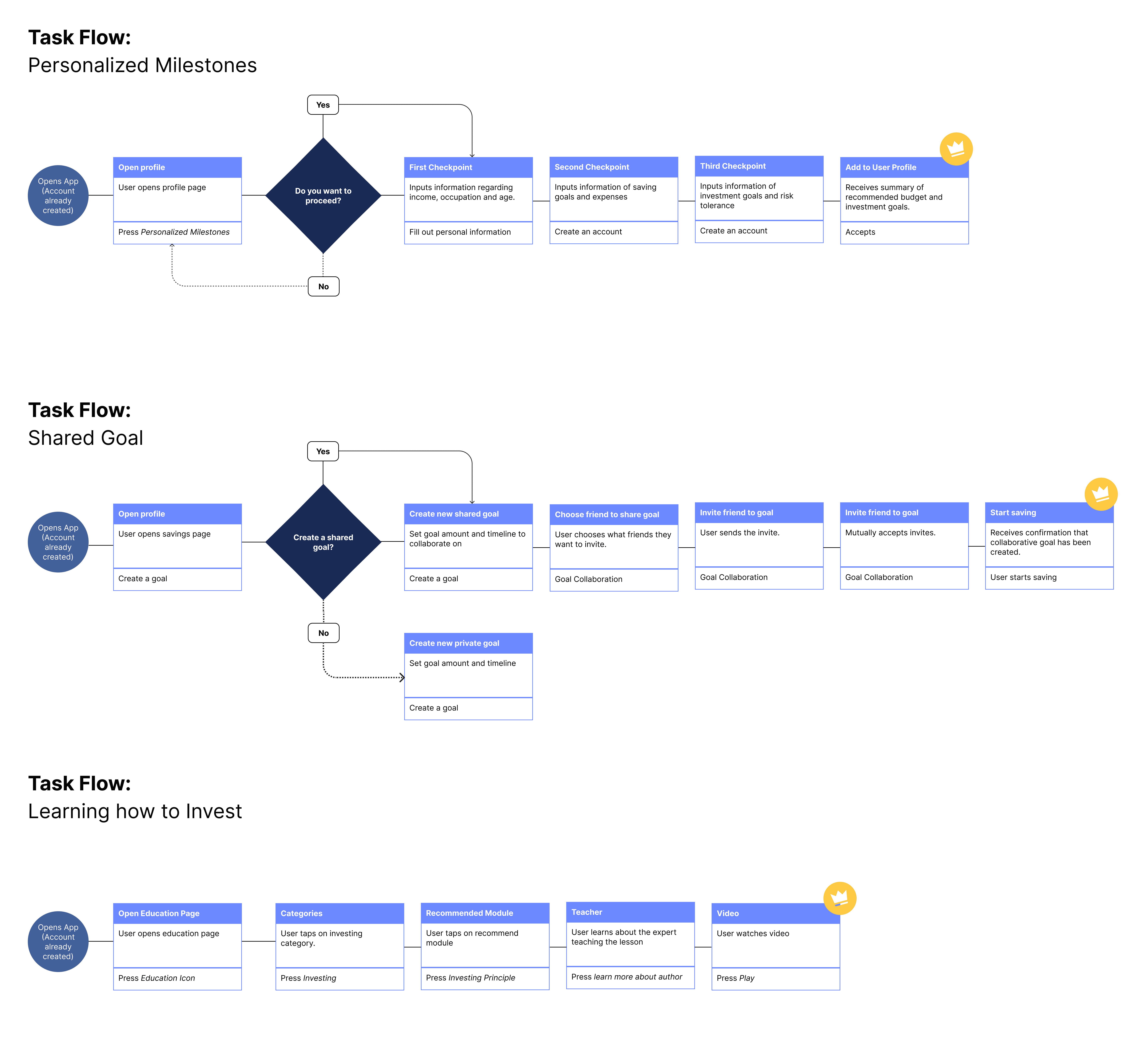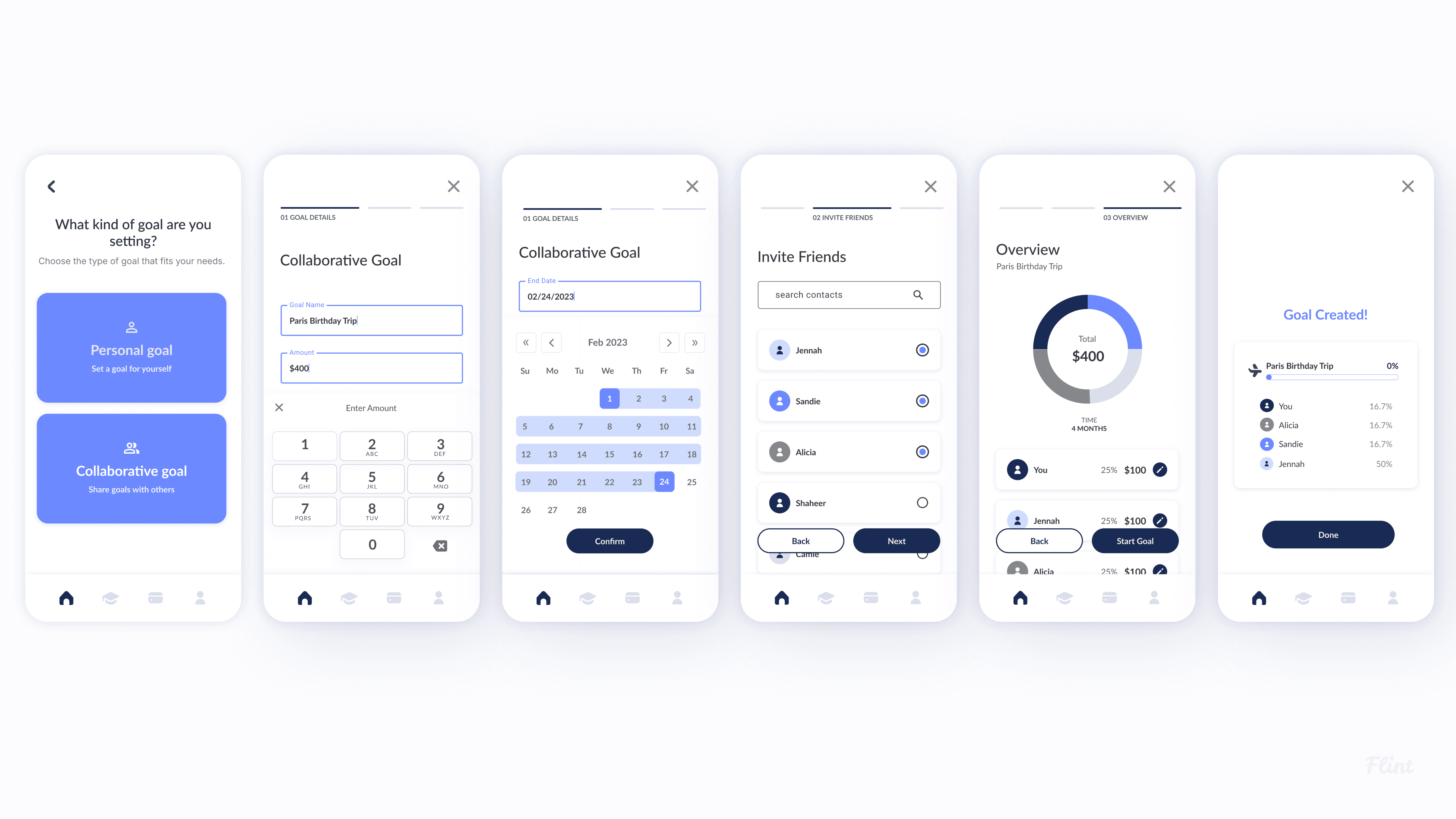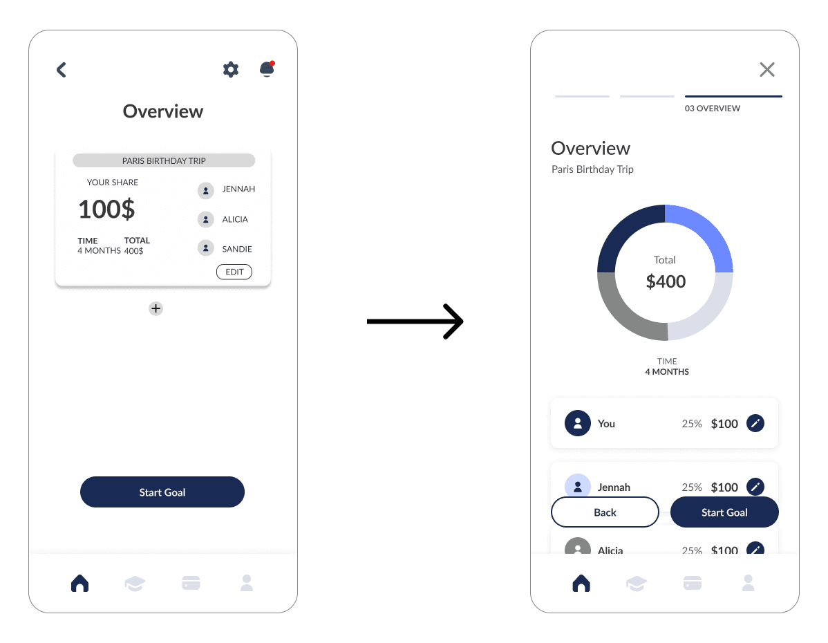 We as a group decided to delegate different flows to a pair, and I received the Collaborative/Shared Goal flow because I came up with the idea to integrate community by sharing goals with loved ones. This idea came forth from my own desire of what would motivate me to save money. Research shows that individuals are more motivated to save when they have a certain goal or reward at the end of their efforts.