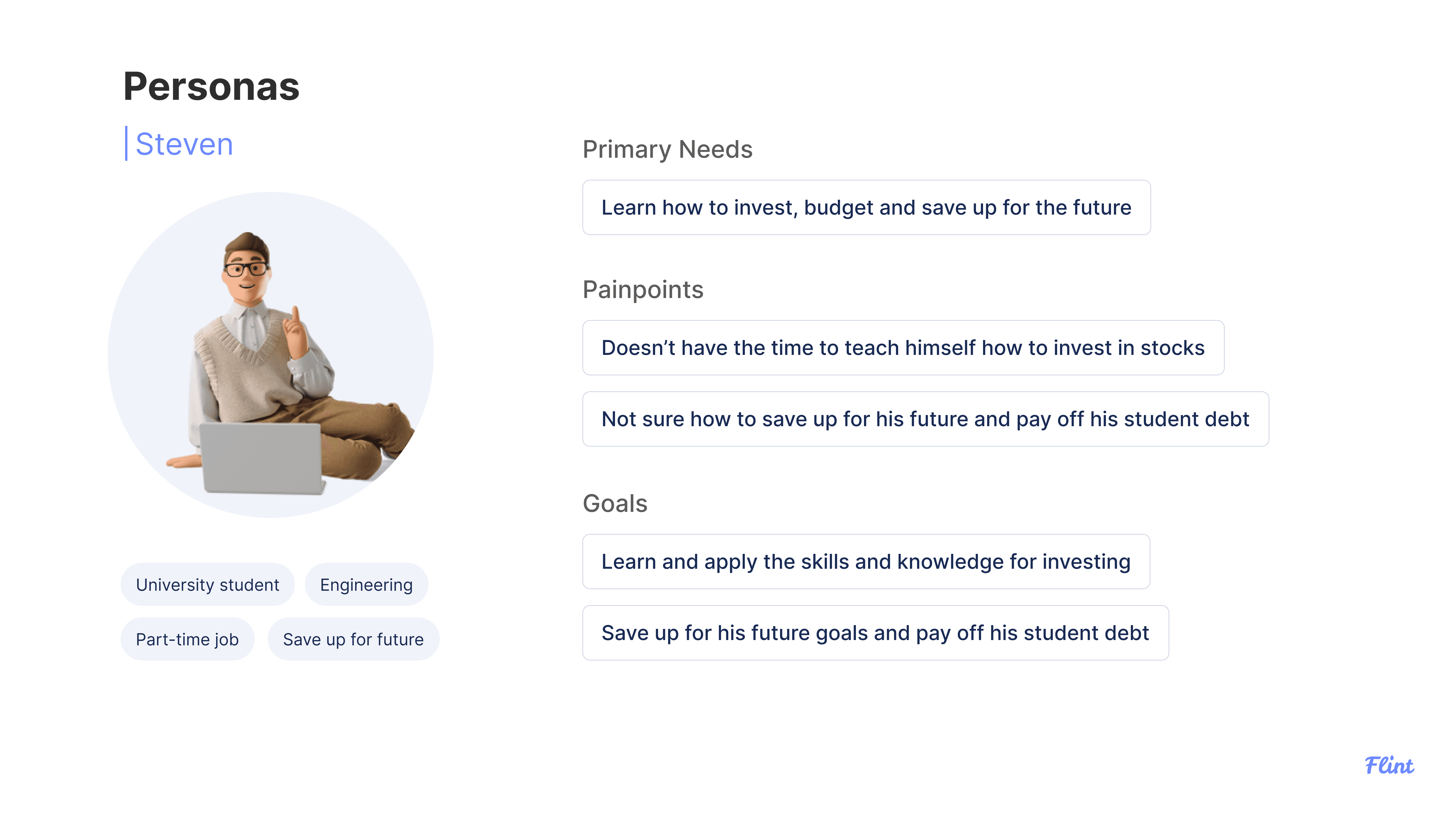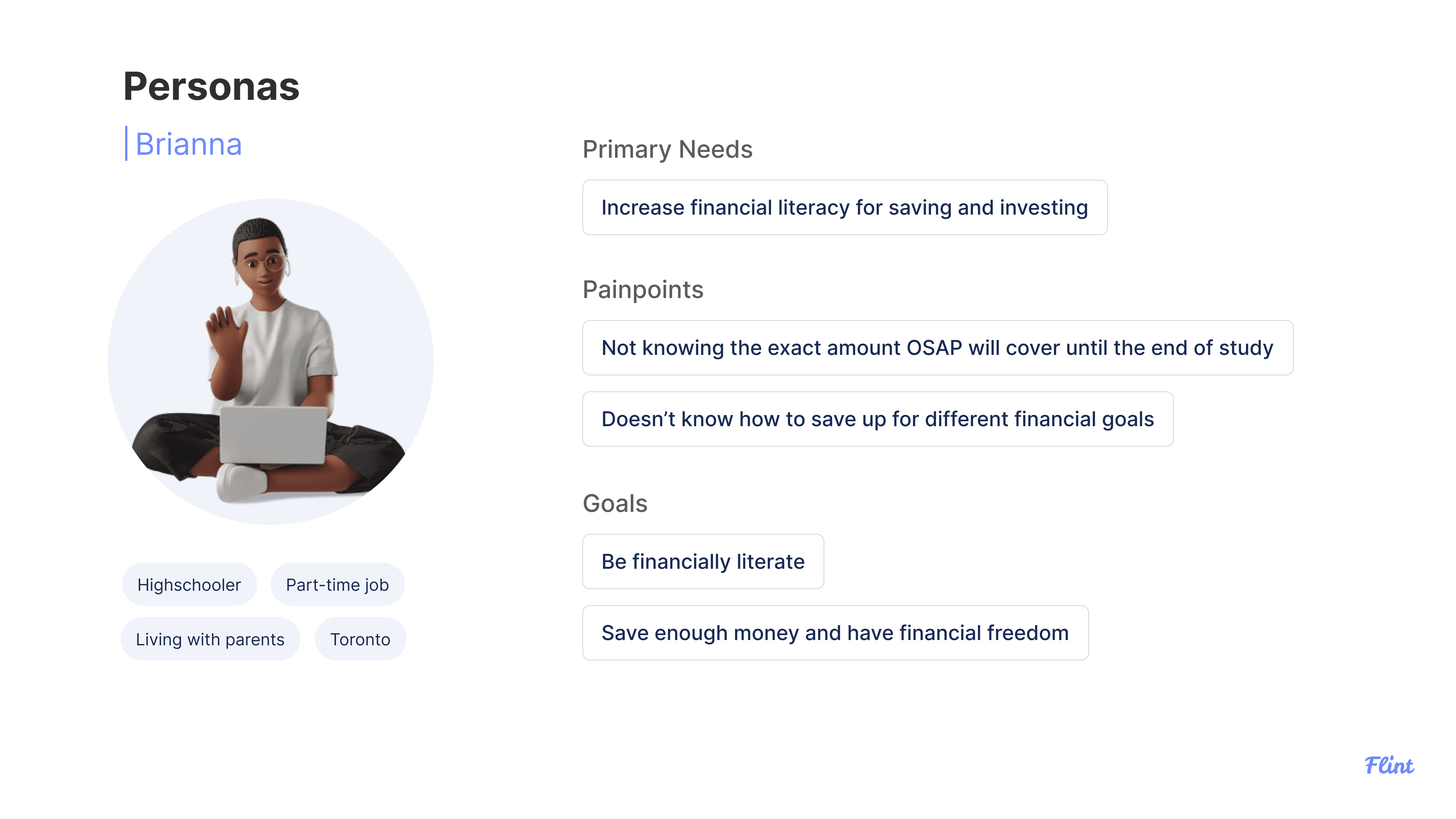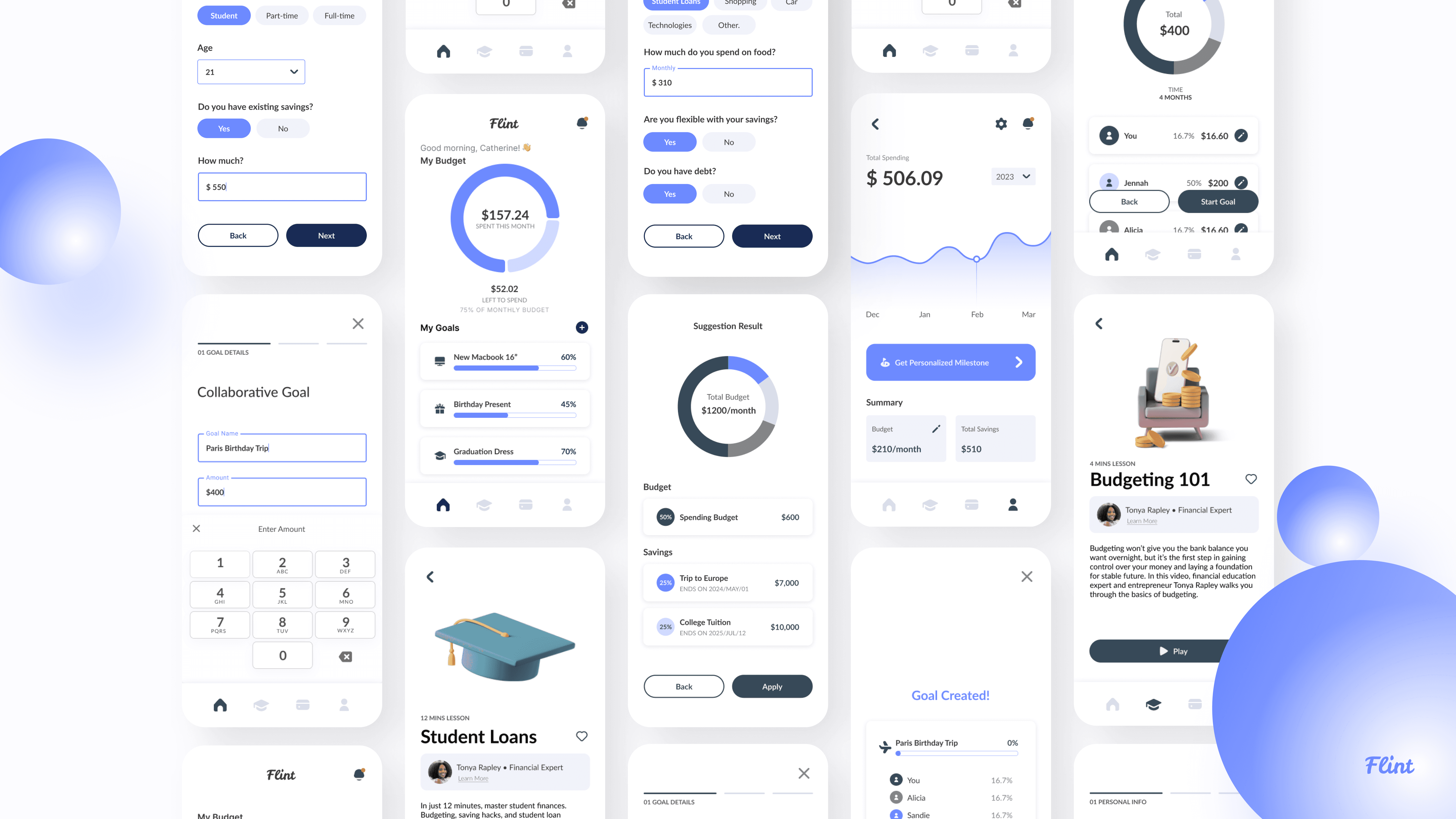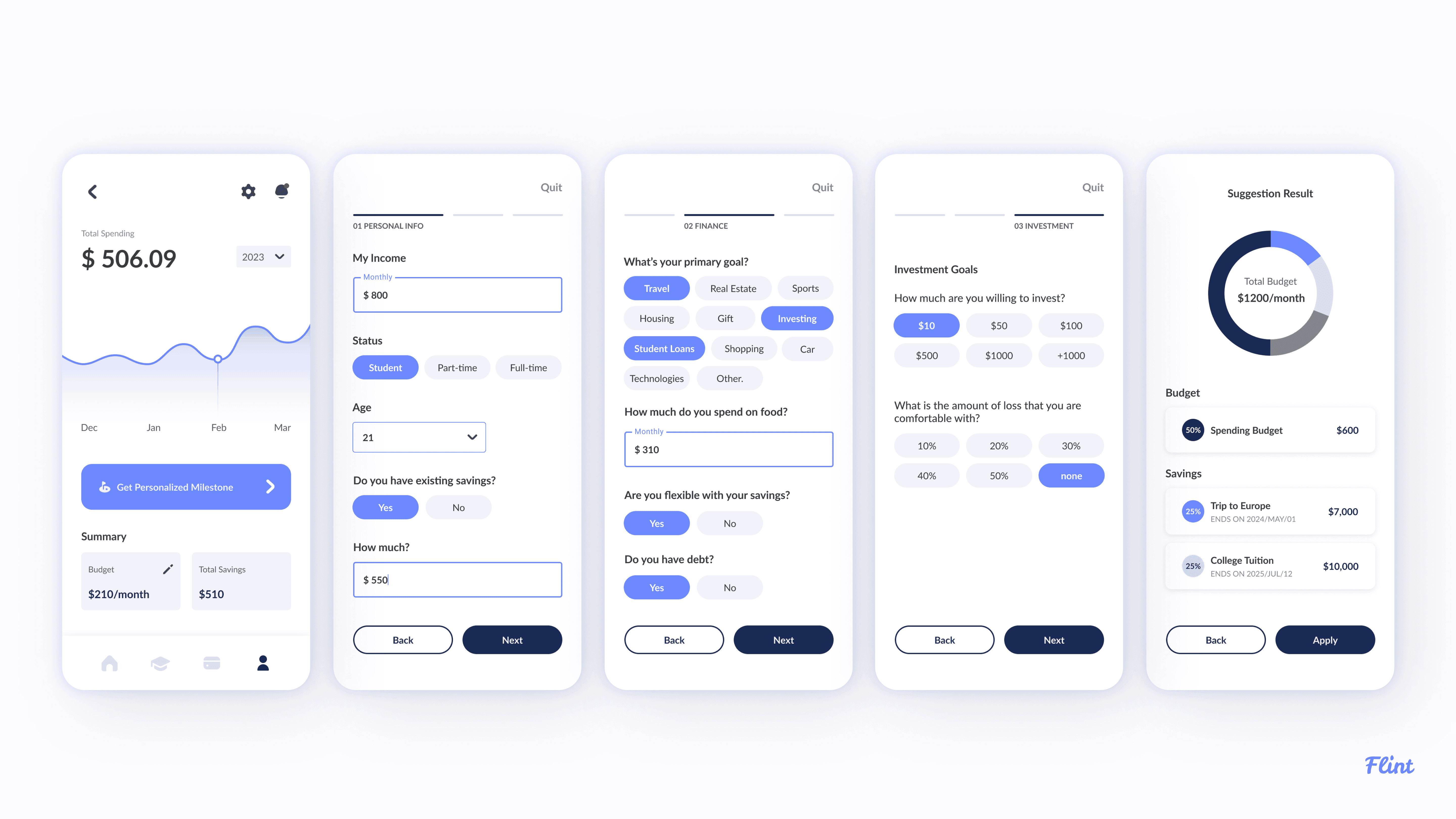 Flint helps young people navigate their finances and allows them to become confident in their independence and savings. Our app aids those to learn and grow in the world through financial learning tutorials and motivates users in their path of saving.